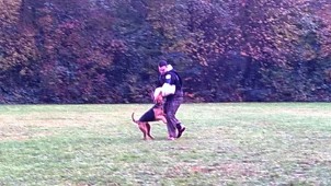 | Der Hund geht schnell, sicher und mit vollem Griff in den Überfall, in der Übergangsphase Griff etwas ruhiger halten, lässt sicher ab und bewacht druckvoll, führiger Seitentransport;