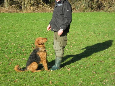 Die Übung "Sitz" funktioniert ohne Hilfe. Ich achte nach der Ausführung und vor der Bestätigung mit Futter auf die Aufmerksamkeit des Hundes zum Hundeführer.