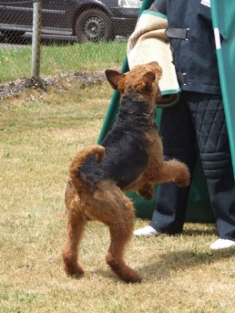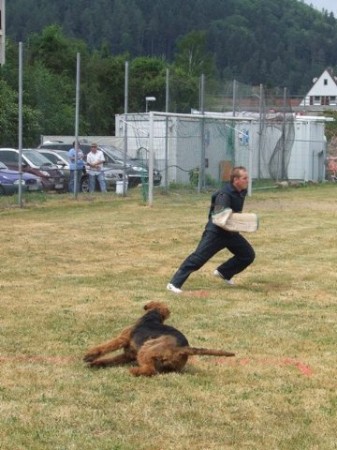 Was Quincy im Schutzdienst zeigte, ist absolut undiskutabel. Nachdem ich ihn das 2. Mal in die Ablage gebracht hatte, lag er gegen die Laufrichtung des Helfers. Eigentlich eine unvorstellbare Situation. Trotzdem erhielt er nach dem Abbruch noch TSB ausgeprägt.
