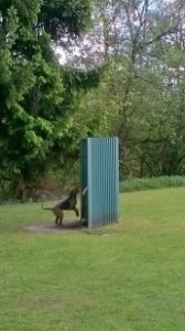 Der Hund läuft die Verstecke schnell und druckvoll an, die Verstecke sollten enger umlaufen werden, der HF sollte die Mittellinie besser einhalten und gleichmäßiger durchlaufen;
