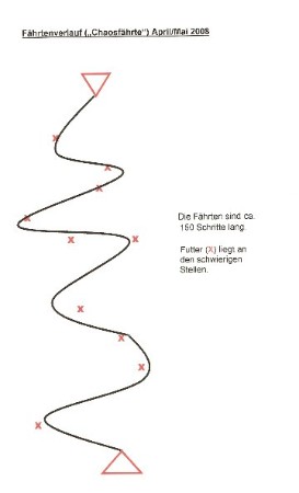 Ergebnis: Die "Chaosfährten" müssen noch etwas besser werden; "Normalfährten i.O.; Futter nur noch am Fährtenanfang und -schluss, sowie als Bestätigung nach "Schwierigkeiten"; Konzentration muss noch besser werden;