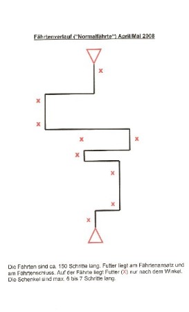 Obwohl ich persönlich mit dem Suchverhalten nicht zufrieden war, hat mir Otmar Goldstein bestätigt, das das Suchverhalten eigentlich in Ordnung ist und der Hund eine VPG 1 Fährte (ohne Gegenstände) innerhalb der nächsten 4 Wochen wird. Um das auszuprobieren habe ich die "Normalfährte" eingeführt. Die Geraden sind max. 5 bis 6 Schritte lang, nach jedem Winkel (nicht im Winkel) kommt Futter zur Bestätigung. Er hatte Recht! Im gewünschten Suchrhytmus werden die Fährten gesucht. Störend ist im Moment nur noch, dass er sich ab und zu ablenken läßt, wenn z. B. ein Vogel hochfliegt oder ein Frosch quackt.