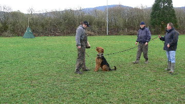 Der zweite Helfer geht mit der Leine auf Zug, damit der Hund den Griff hält.