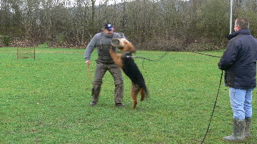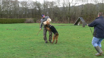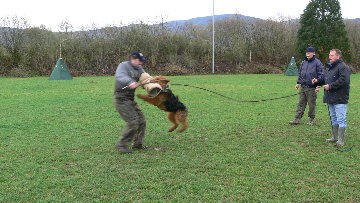 Wichtig ist das beim Angriff der Schutzarm nach oben gezogen wird und der Hund hineinspringen muss. Dadurch macht der Hund bei Prüfungen, wo das nicht so ist, einen vollen Griff.