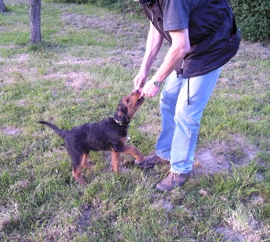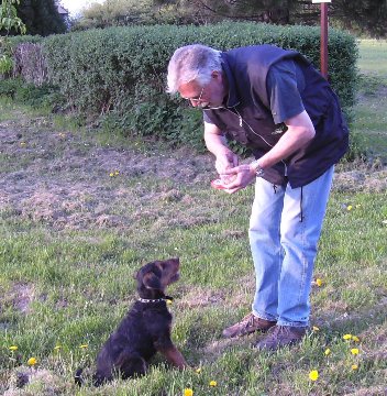 Daumen auf die Schnauze und den Hund mit Futter ins "Platz" bringen. Alle Aktionen werden nur mit Futter und noch ohne Kommandos durchgeführt.