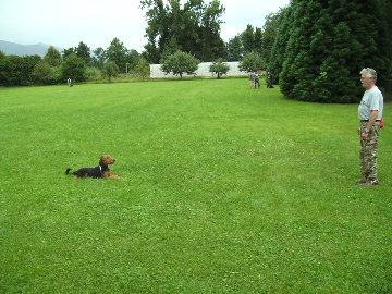 Ich bleibe dann stehen. Gebe nochmals das Kdo. "Platz" und warte. Gehe zum Hund zurück und es folgt "Platz", "Brav" und "Jawohl". Das wiederhole ich 5 bis 6 mal. Inzwischen sind bei ca. 15 m Entfernung und 20 bis 30 Sekunden.