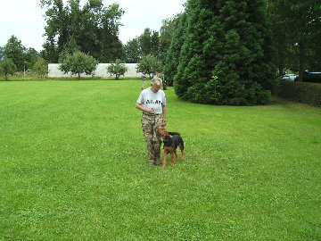 Ich habe mit der Ablage bzw. Entfernen vom Hund begonnen. Nachdem Kdo. "Platz" kommt die Ermutigung mit "Brav" und die Freigabe der Belohnung mit "Jawohl". Ich entferne mich dann rückwarts vom Hund.