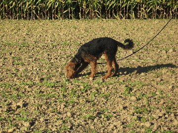 Dann kommt das Kdo. "Such". Der Hund nimmt ruhig die Würstchen im Abgang auf.