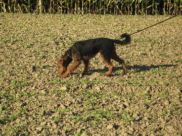 Ich habe jetzt die Fährte in normaler Schrittfolge gelegt. Die Futterstücke liegen etwas 40 cm auseinander. Das Suchtempo ist jetzt optimal, der Hund sucht ruhig, intensiv und mit tiefer Nase. (14 Übungseinheiten)