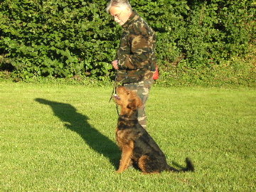 Der Hund wird bei beidseitiger Aufmerksamkeit mit dem Kdo. "Sitz" in Grundstellung gebracht. Die Übung ist in Ordnung. Ermutigung mit "Brav", danach Freigabe der Belohnung mit "Jawohl".