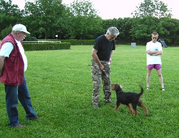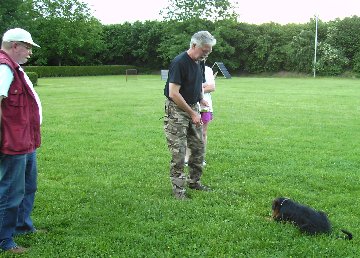 Mit Futter den Hund in Vorsitz bringen. Ermutigung mit "Brav". Freigabe der Belohnung (Futter) mit "Jawohl". Die Schussfestigkeit wurde auch überprüft. Ist o.k..