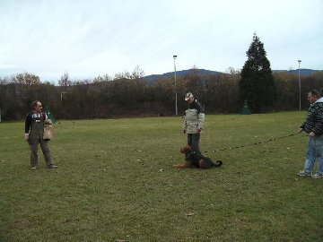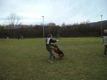 An der kurzen Leine wird der Hund "Beifuß" zum Helfer geführt und ins "Platz" gebracht. Ein zweiter Helfer hat den Hund an der langen Leine,