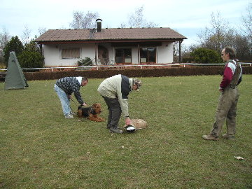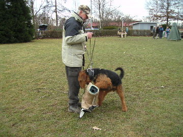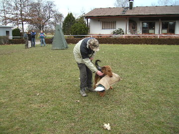 ...danach ins "Platz" bringen und dem Helfer ganz ruhig den Schutzärmel bringen.