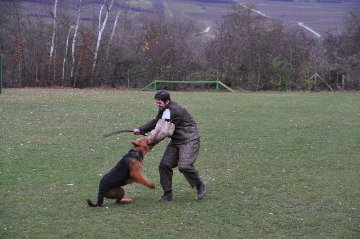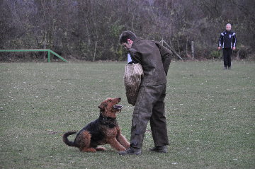 Die Fährte war eigentlich soweit i.O.. Der nicht verwiesene Gegenstand war aus Kunststoff, wurde angezeigt, aber nicht verwiesen. Beim dem "versauten" Winkel hat er Rückenwind und wurde praktisch darüber geblasen. Bei Schwierigkeiten auf der Fährte fehlt ihm einfach noch die Erfahrung. Die Unterordnung ist eigentlich auch soweit i.O., die kleinen Fehler entstehen eher aus seinem Übereifer. Im Schutzdienst ist Quincy einfach manchmal etwas durchgeknallt und zu ungeduldig. Die Anbisse sind meistens in Ordnung, aber dann werden die Griffe doch sehr unruhig.